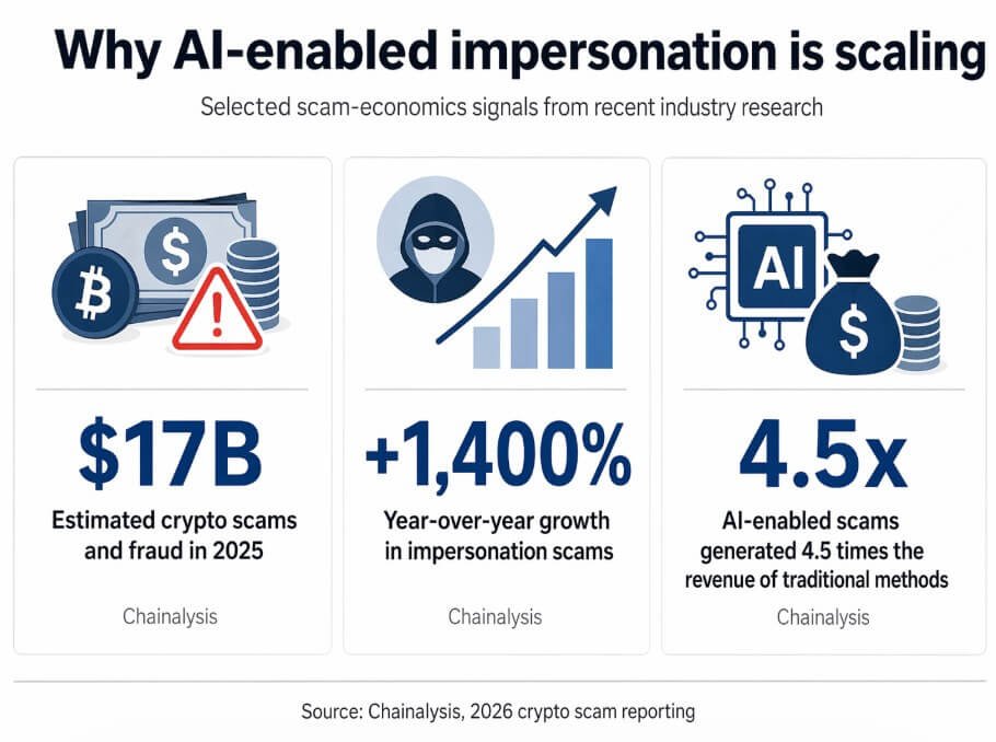 Chainalysis estimated that crypto scams and fraud reached $17 billion in 2025, with impersonation scams up 1,400% year over year and AI-enabled scams generating 4.5 times as much revenue as traditional methods.