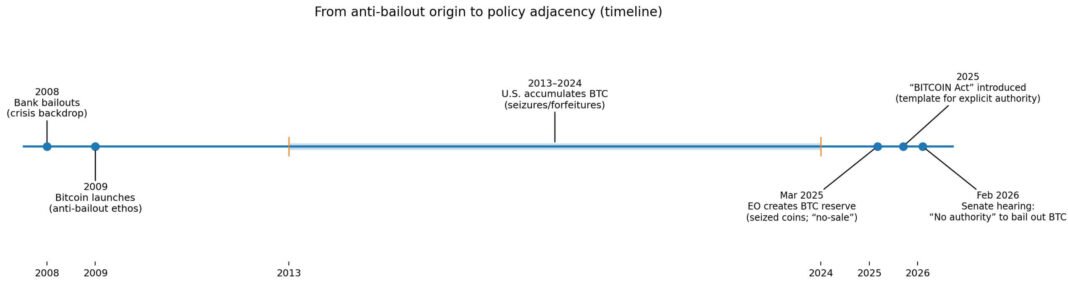 Timeline shows Bitcoin’s evolution from its 2009 anti-bailout origins to February 2026 Senate hearing where Treasury confirmed no authority to bail out Bitcoin.