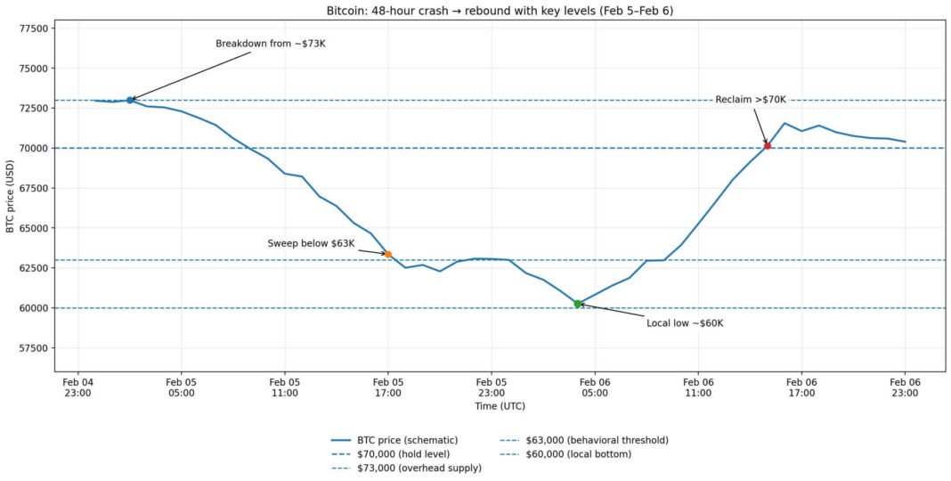 Bitcoin ripped from $60,000 to above $70,000 in less than 24 hours, erasing most of a brutal 14% drawdown that had tested every bottom-calling thesis in the market.