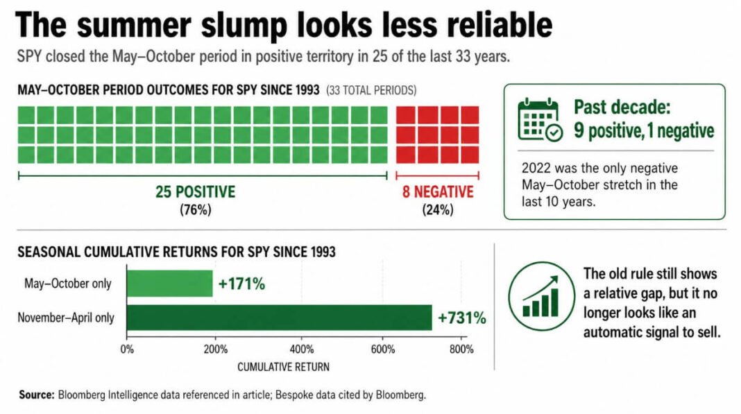 Bespoke data cited by Bloomberg shows the cumulative return from holding SPY is only in May-October since the ETF’s 1993 debut, at roughly 171%. That is real money, just considerably less than the 731% earned by staying long only in November-April.