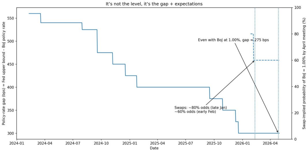 Chart shows Bank of Japan policy rate narrowing the gap with Fed rates while swap markets price declining probability of a 1% April hike.