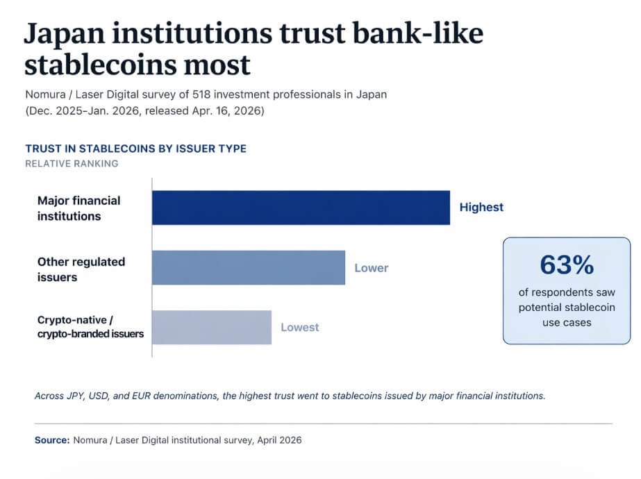 A Nomura and Laser Digital survey of 518 Japanese investment professionals found major financial institution-issued stablecoins ranked highest in trust, with crypto-native issuers ranking lowest.