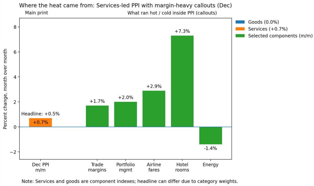 Portfolio management, airfares, and lodging all show up as inputs to core PCE, meaning December’s hot PPI creates an upward tilt for the print markets that will be scrutinized in three weeks.