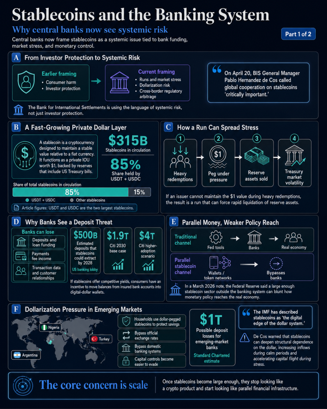 The deposit drain plays out primarily in developed economies because the dollarization problem is global. De Cos warned that stablecoins can accelerate the structural dependence of developing economies on the dollar while making it easier to evade capital controls, leading to larger inflows during stable periods and faster capital flight during stress.