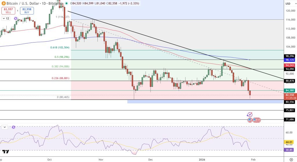 Looking at Fibonacci levels, BTC has dropped below the 0.236 retracement at $88,900 and is now moving toward the 0% level near $80,500, which is the next big downside target. Losing the $84,600 horizontal support shows the bearish trend is continuing, not just consolidating.