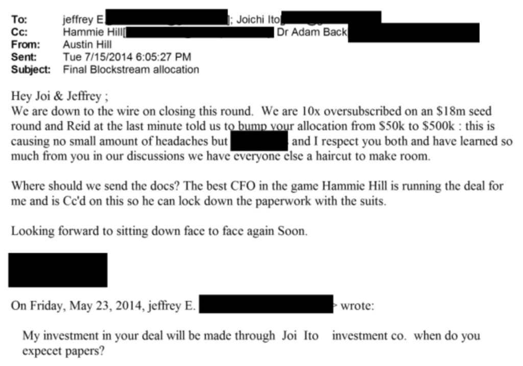 Among the newly surfaced records is a July 2014 email exchange in which Blockstream co-founder Austin Hill discussed the company’s oversubscribed $18 million seed round with Epstein and Ito.
