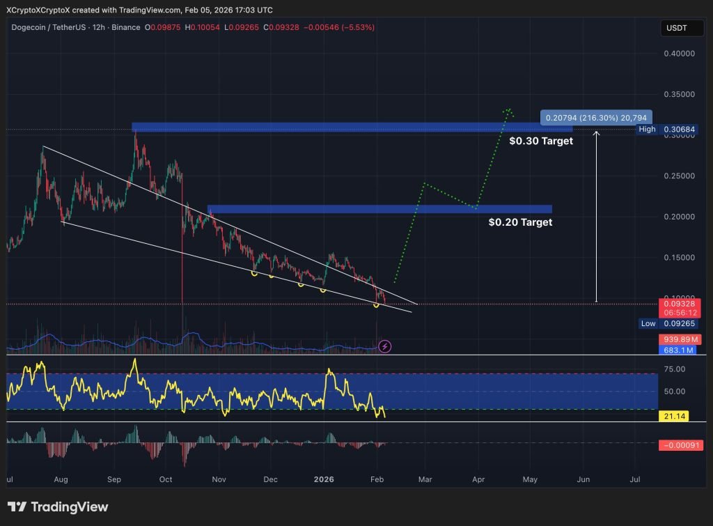 - Bullish Targets: If DOGE can hold the $0.095 support and break out of the wedge’s upper trendline, the chart projects a significant recovery. The first major resistance sits at $0.20, with a secondary target at $0.30.
