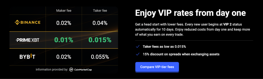 PrimeXBT charges among the lowest crypto exchange fees among the top platforms. The PrimeXBT VIP 2 fees are set at 0.01% (maker) and 0.015% (taker). Binance charges a futures fee of 0.02% maker and 0.04% taker, while Bybit lists 0.02% maker and 0.055% taker for USDT perpetual and futures contracts.