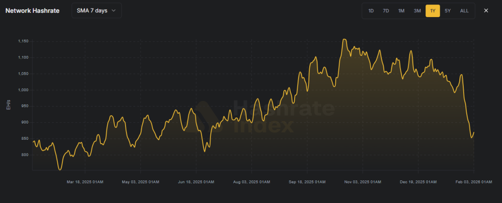 Entering early 2026, some pressure has eased. Network hashrate has fallen below 1,000 EH/s for the first time since September, dipping to 870 EH/s at points following winter storms and reduced profitability.