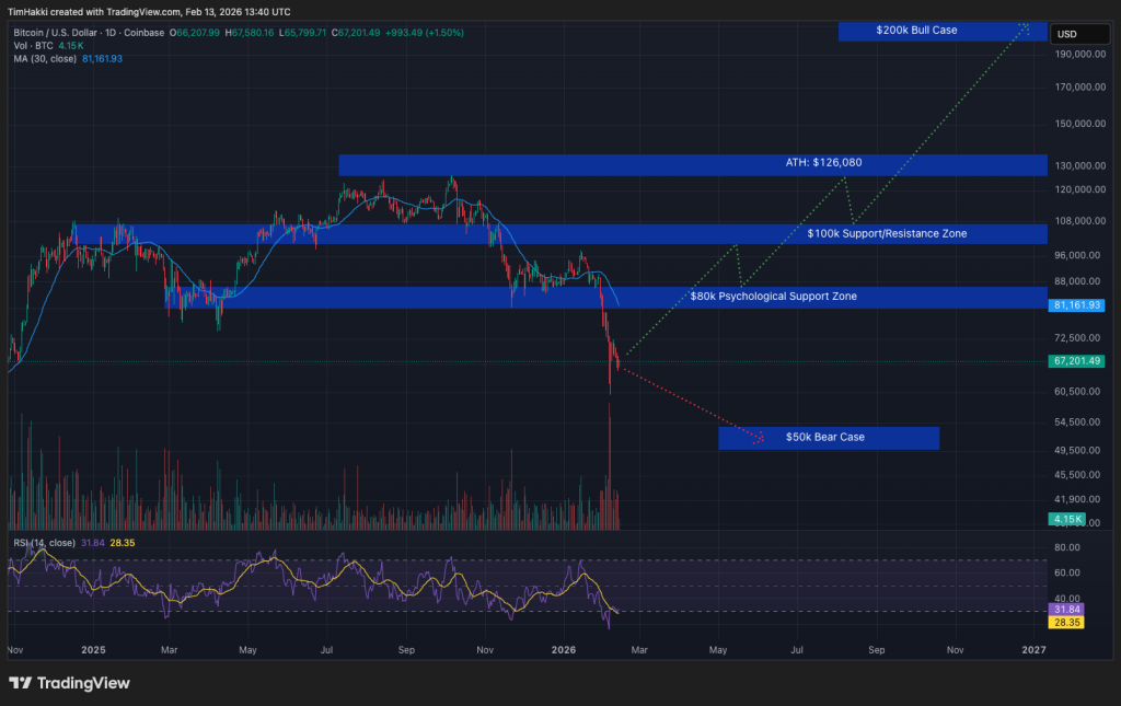 Let’s look at the charts. Bitcoin is trading just above $67,000, a brutal 47% drop from its October 2025 all-time high of $126,080.