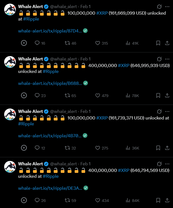 That said, XRP will not bear the full weight of the 1 bullion token release. Whale Alert reported that 700 million XRP was re-locked in a 55-month escrow, leaving a net 300 million unlocked for the February period.